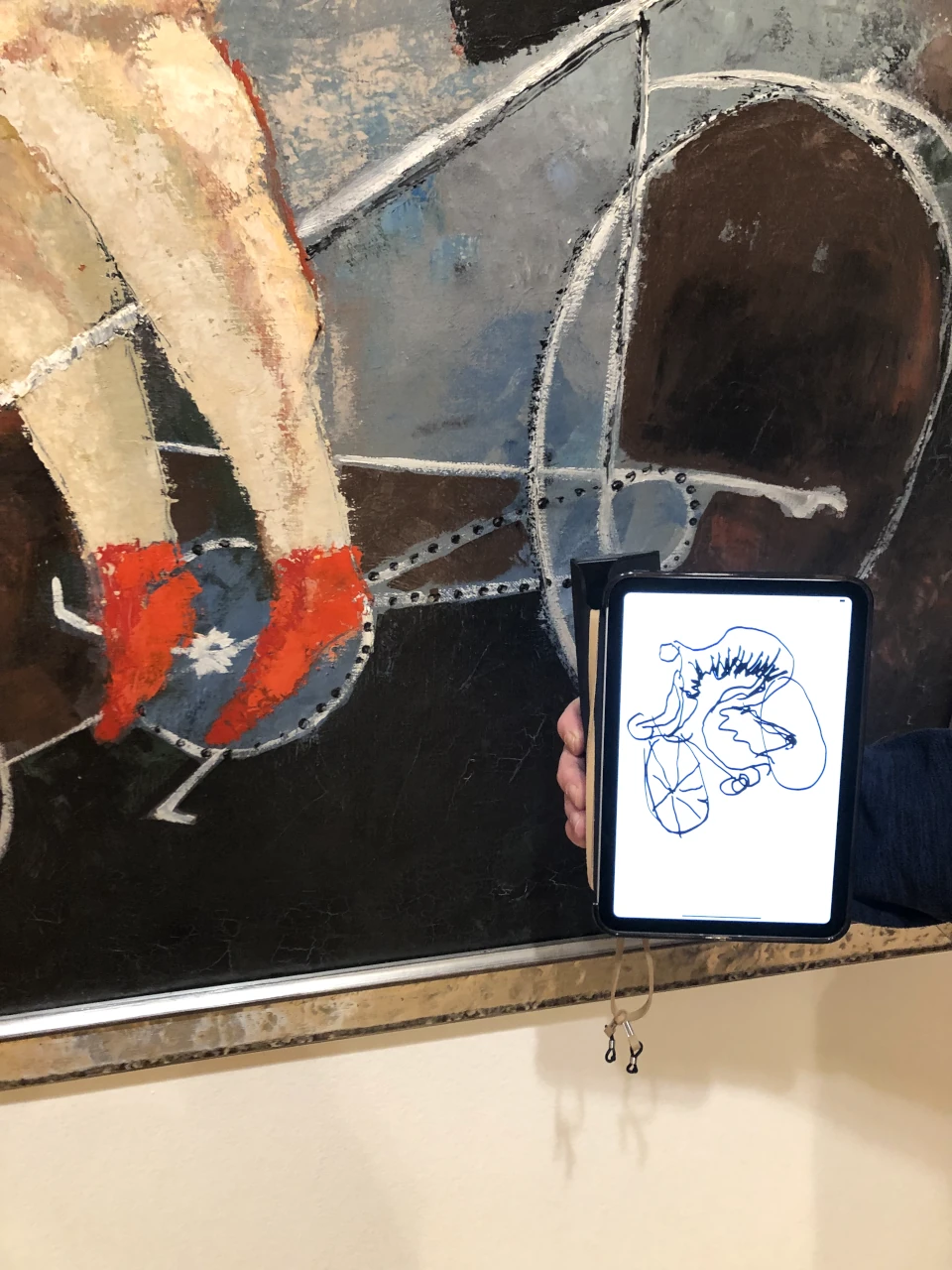 Esta vistosa pintura tiene el encanto de trasladarnos a una escena urbana de hace muchas décadas, cuando se producían automóviles con aletas voladas, por fuera de la carrocería, y con ruedas de radios, del tipo Fiat Balilla de 1934. Aquí, dos mujeres, posiblemente madre e hija, dan un paseo en coche con chófer, que lleva una gorra de uniforme. Con gran expresionismo, encontramos las señas diferenciales del estilo del autor, con los rostros de los personajes desdibujados, un capricho visual, como detalle cubista, de un parabrisas situado en el lateral, y radios excéntricos en las ruedas y en el pequeño volante que sostiene el chófer. La profusión de señales de tráfico, semáforos y otros símbolos nos trasladan la ironía del artista. Incluimos en estas rarezas lo que parece un paso de cebra distorsionado y sobre el que pasa el vehículo, que nos recuerda también a los radios irregulares.