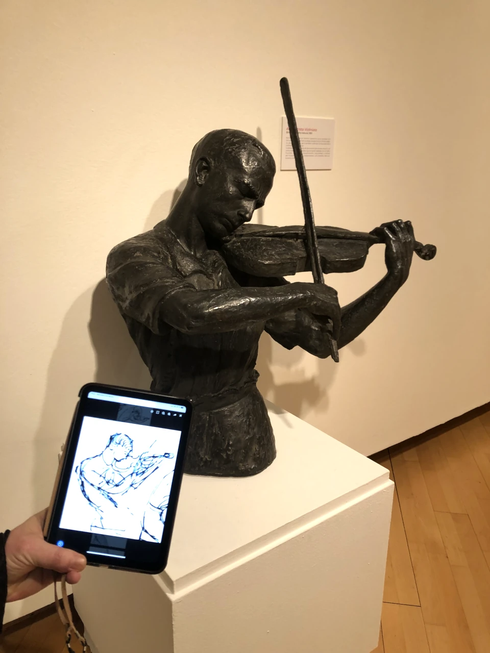 Escultura realizada en bronce cuando el autor contaba con tan solo 22 años, aún en su etapa academicista. Artista plástico, escultor y pintor, pero también violinista, la obra derrocha vitalidad y musicalidad. A destacar la delicadeza de las manos que toman el arco y el instrumento, con la cabeza ligeramente ladeada con el ceño fruncido, que denota concentración, naturalidad y actitud del músico apasionado interpretando una melodía.