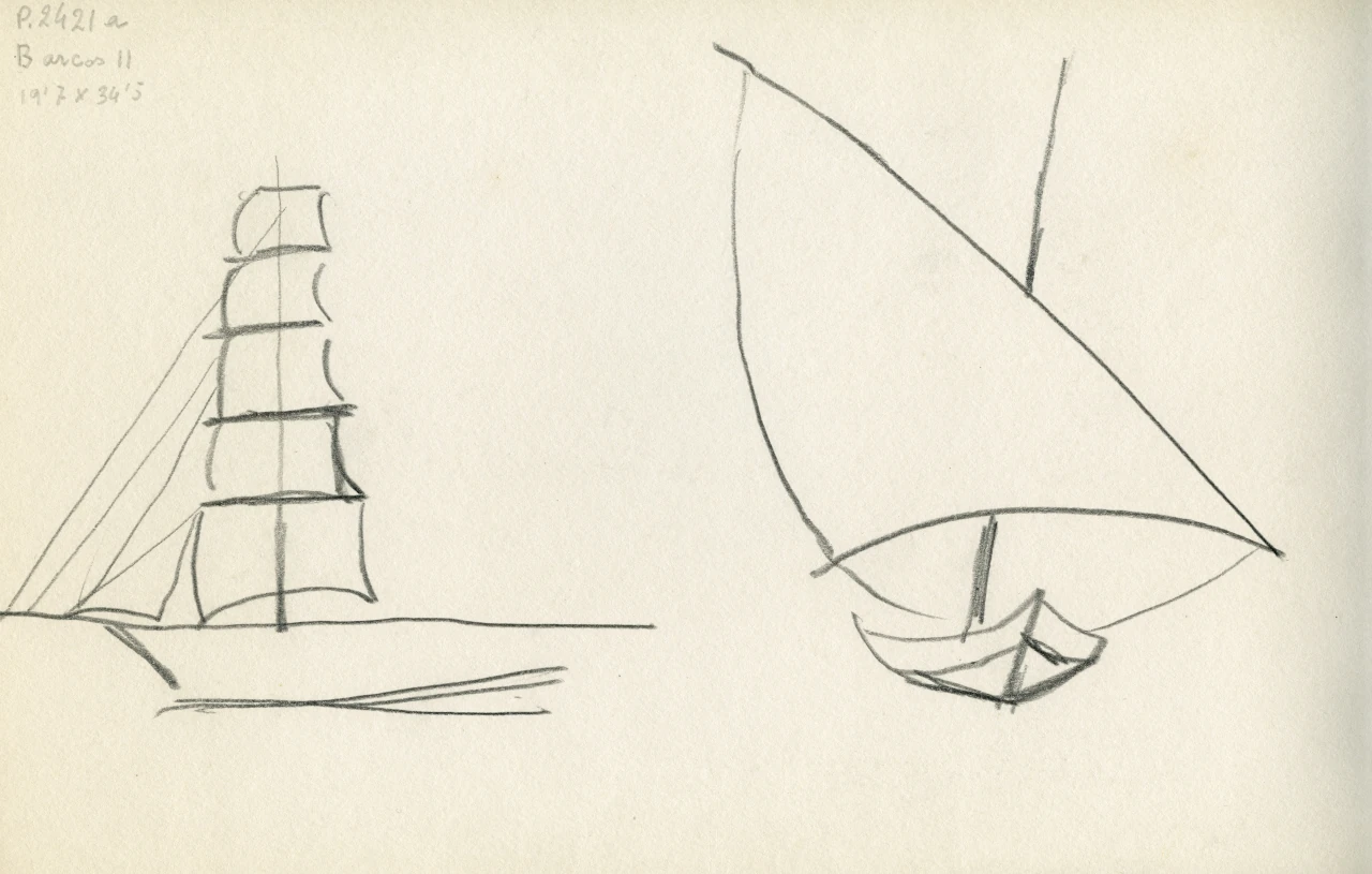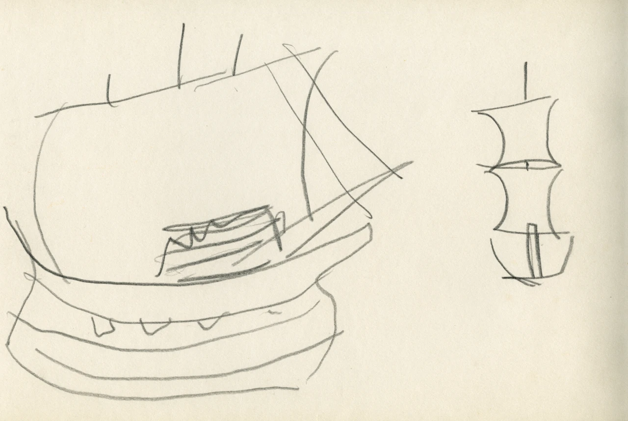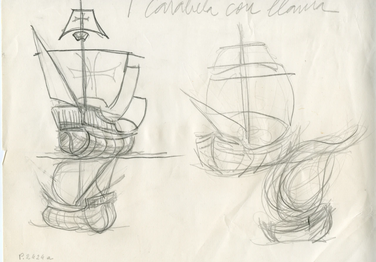 Mástil: bocetos de embarcaciones, incluída una carabela realista