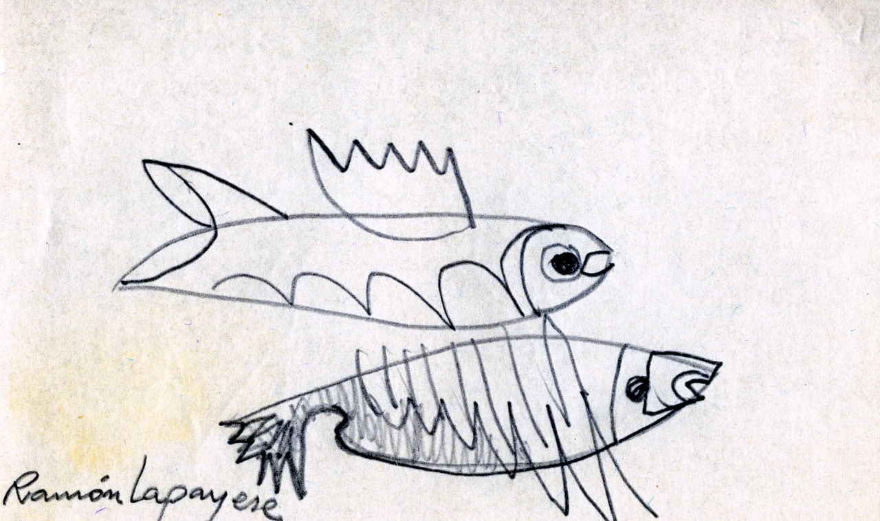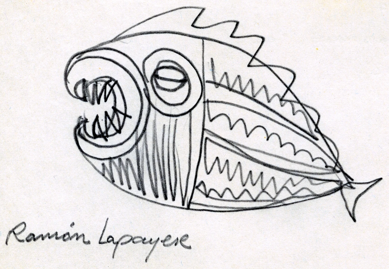Pesca submarina: bocetos de peces y cartel de exposición en 1982