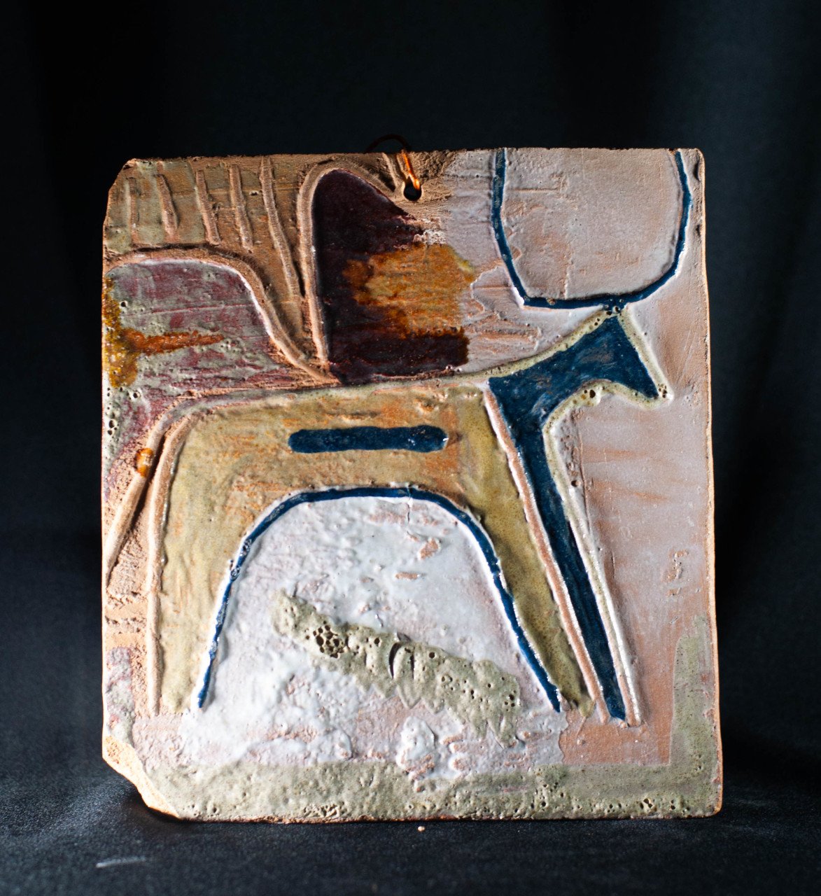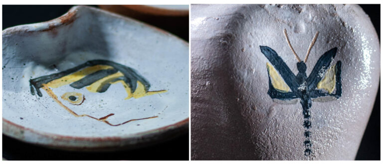 Queda también un baldosín esmaltado con un motivo inspirado en las pinturas rupestres: de nuevo nos hallamos ante una muestra del interés del artista por el arte primitivo, y una pieza que pudiera parecer una botella, en forma humana, pero sin utilidad aparente.