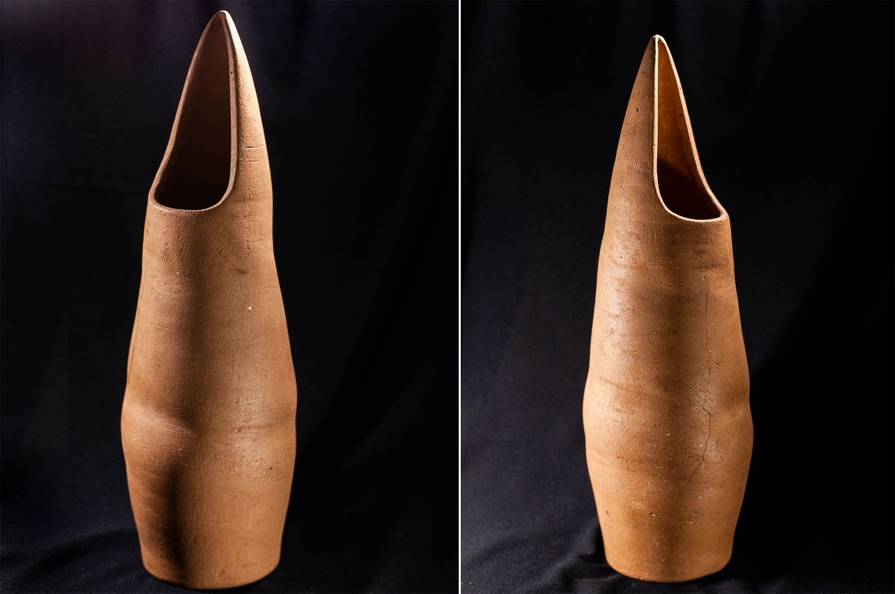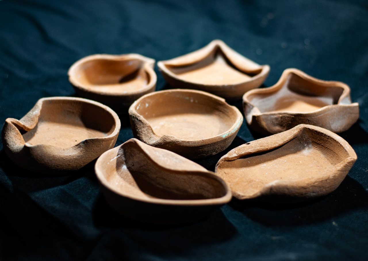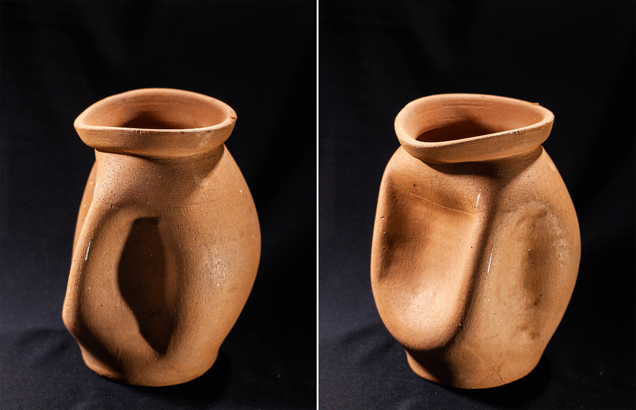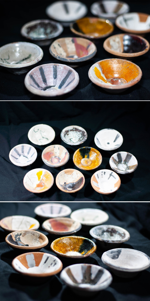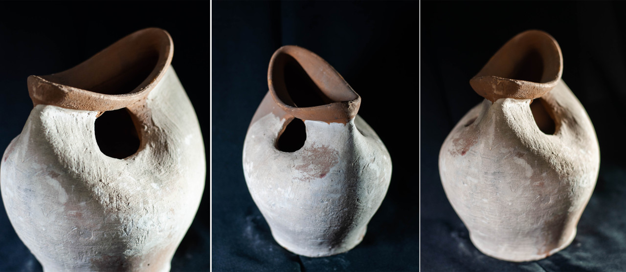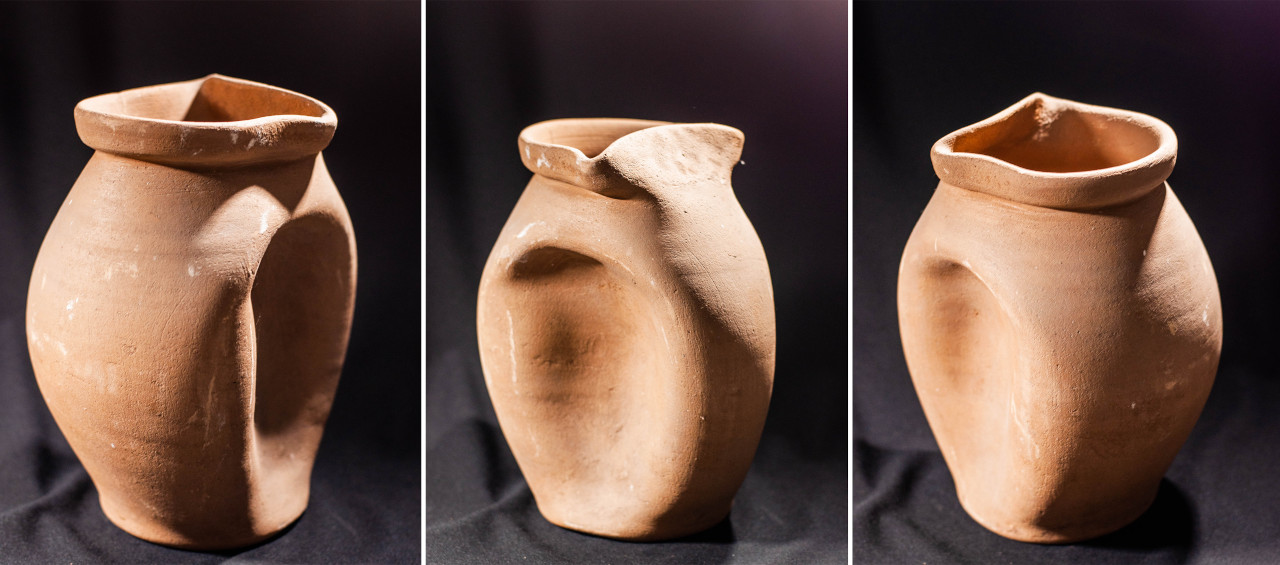 Algunas incluyen un agujero en medio, todo asimetrías y movimiento, frecuentemente pellizcados y con abolladuras, con o sin asa, y tanto en arcilla gris como roja.
