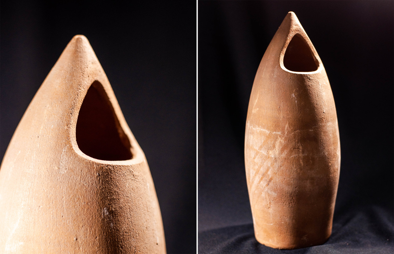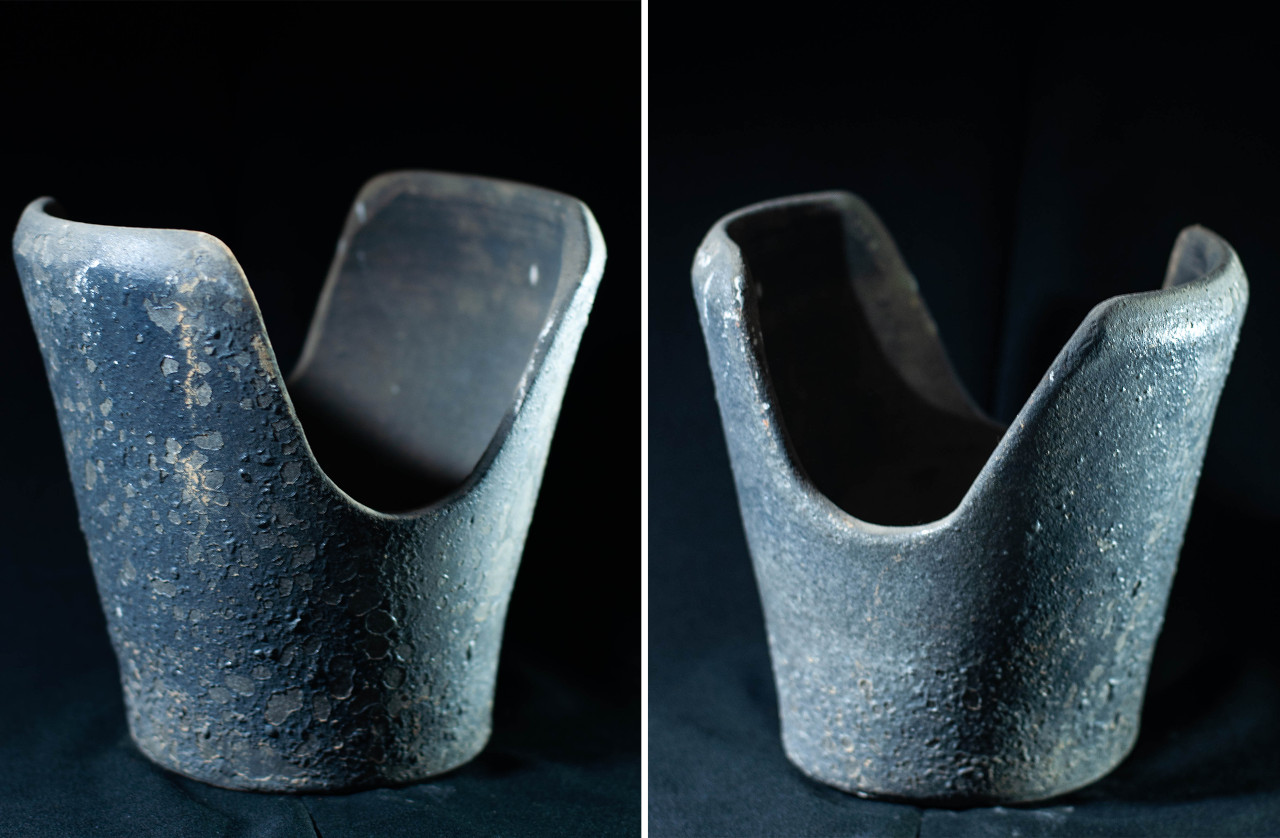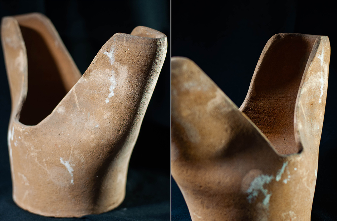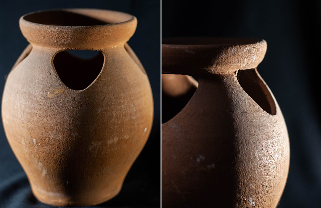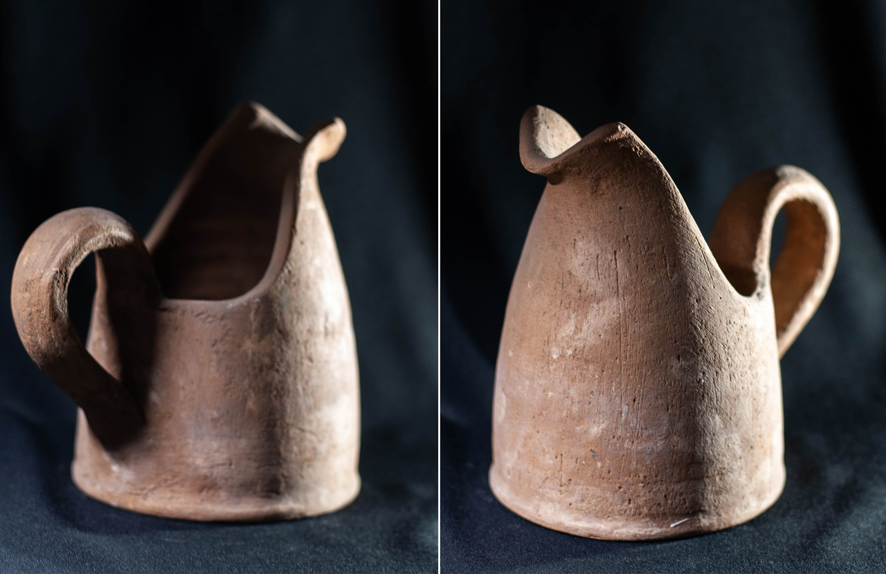 Algunas incluyen un agujero en medio, todo asimetrías y movimiento, frecuentemente pellizcados y con abolladuras, con o sin asa, y tanto en arcilla gris como roja.