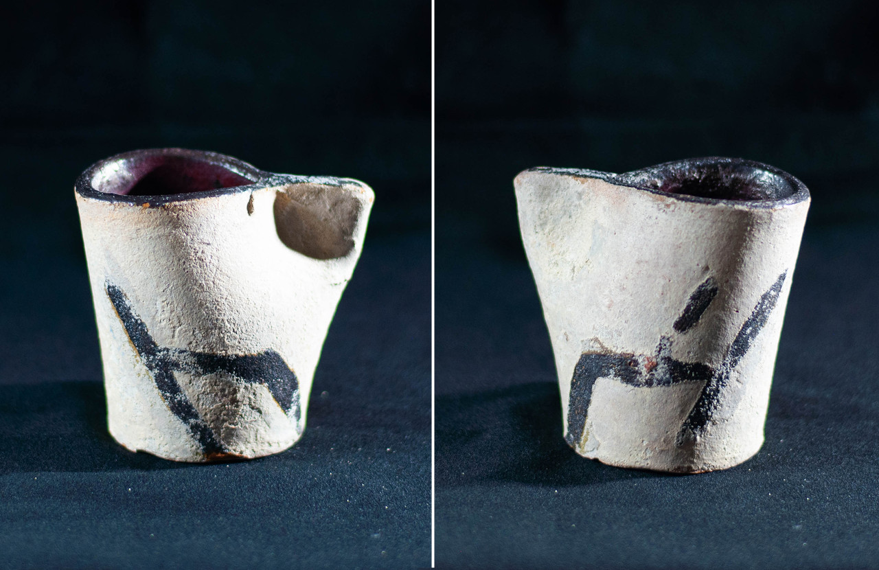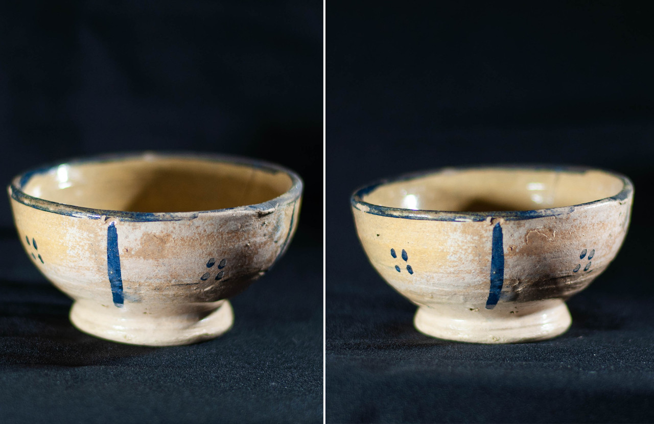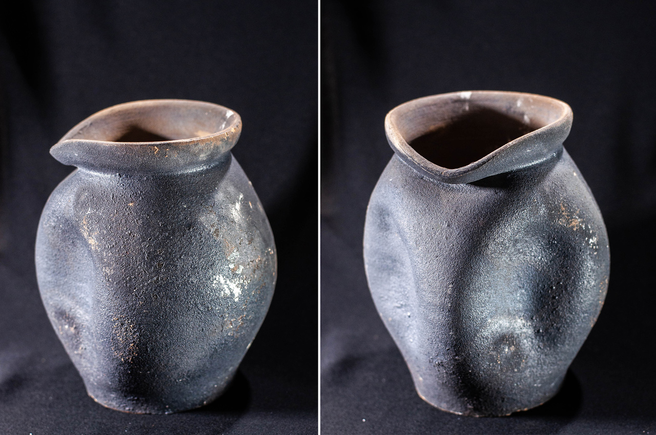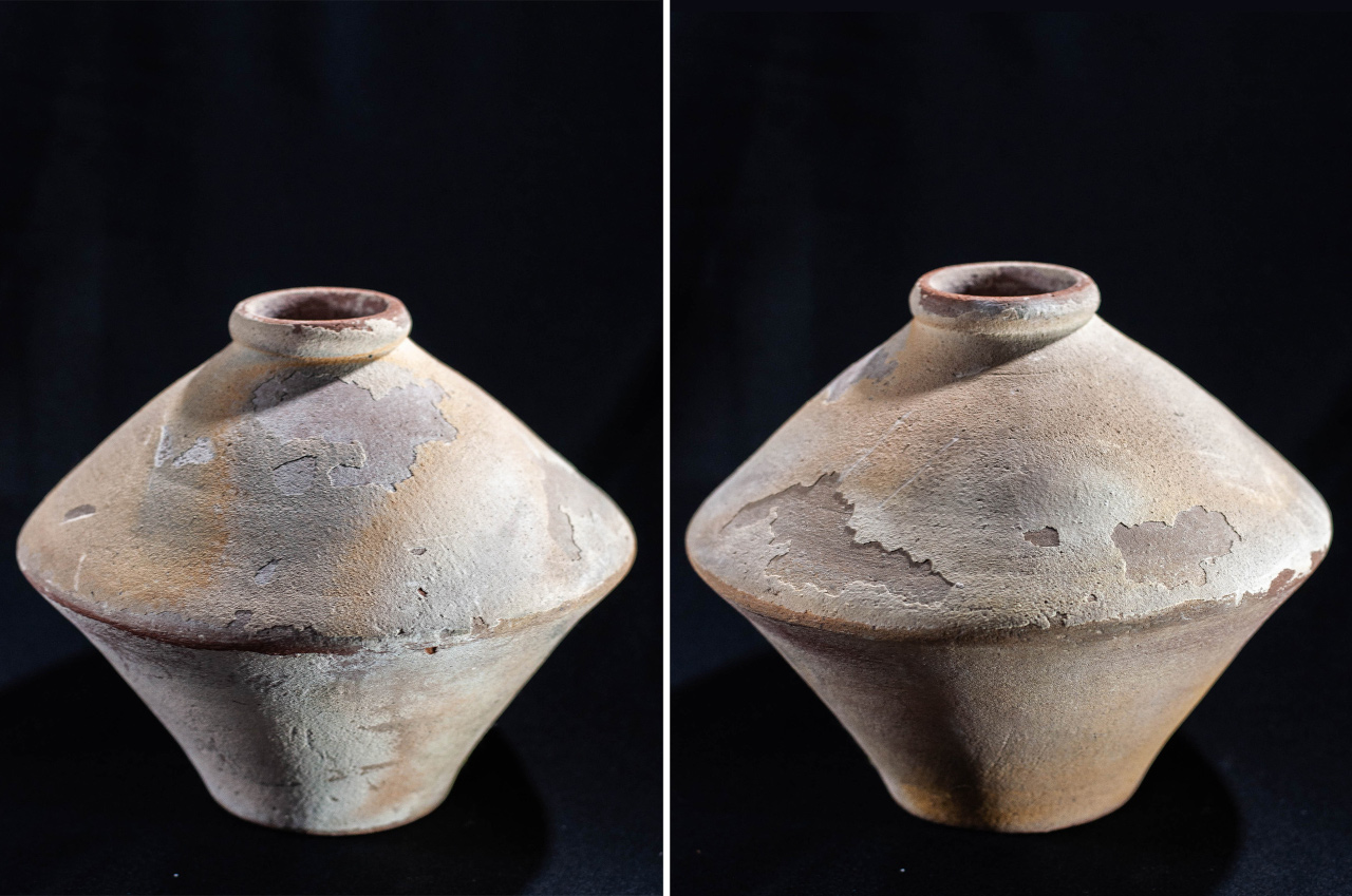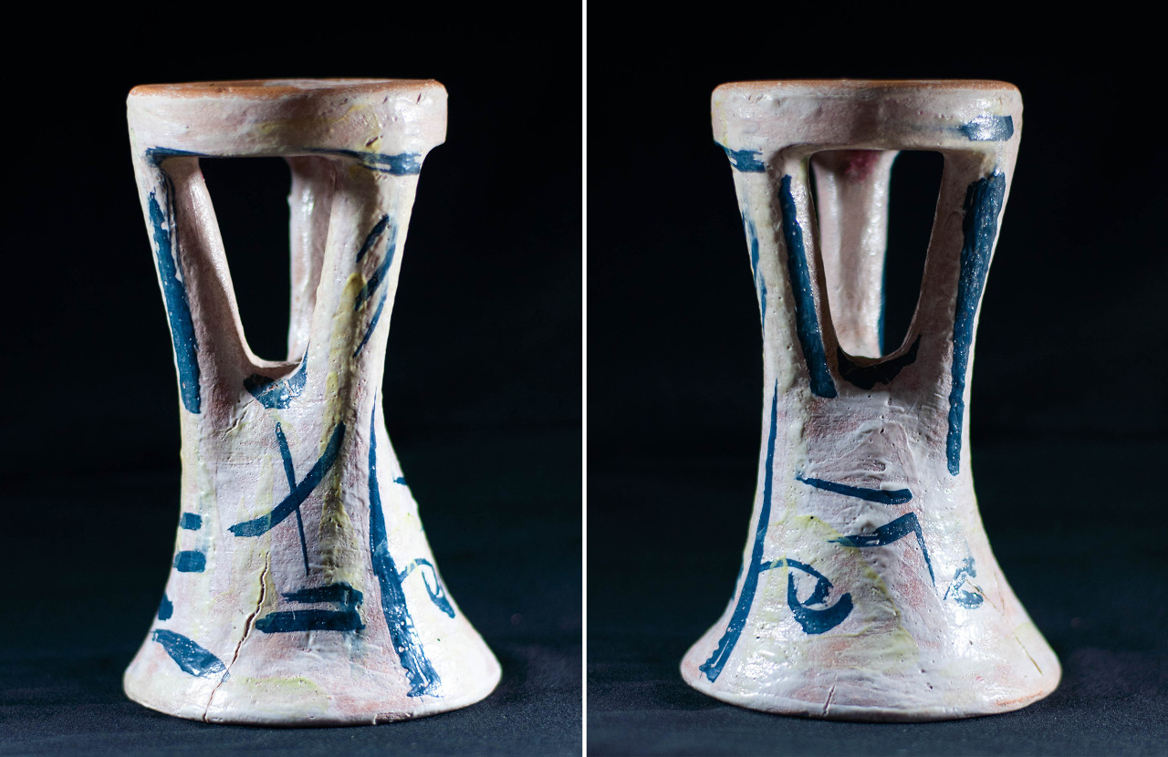 Algunas incluyen un agujero en medio, todo asimetrías y movimiento, frecuentemente pellizcados y con abolladuras, con o sin asa, y tanto en arcilla gris como roja.