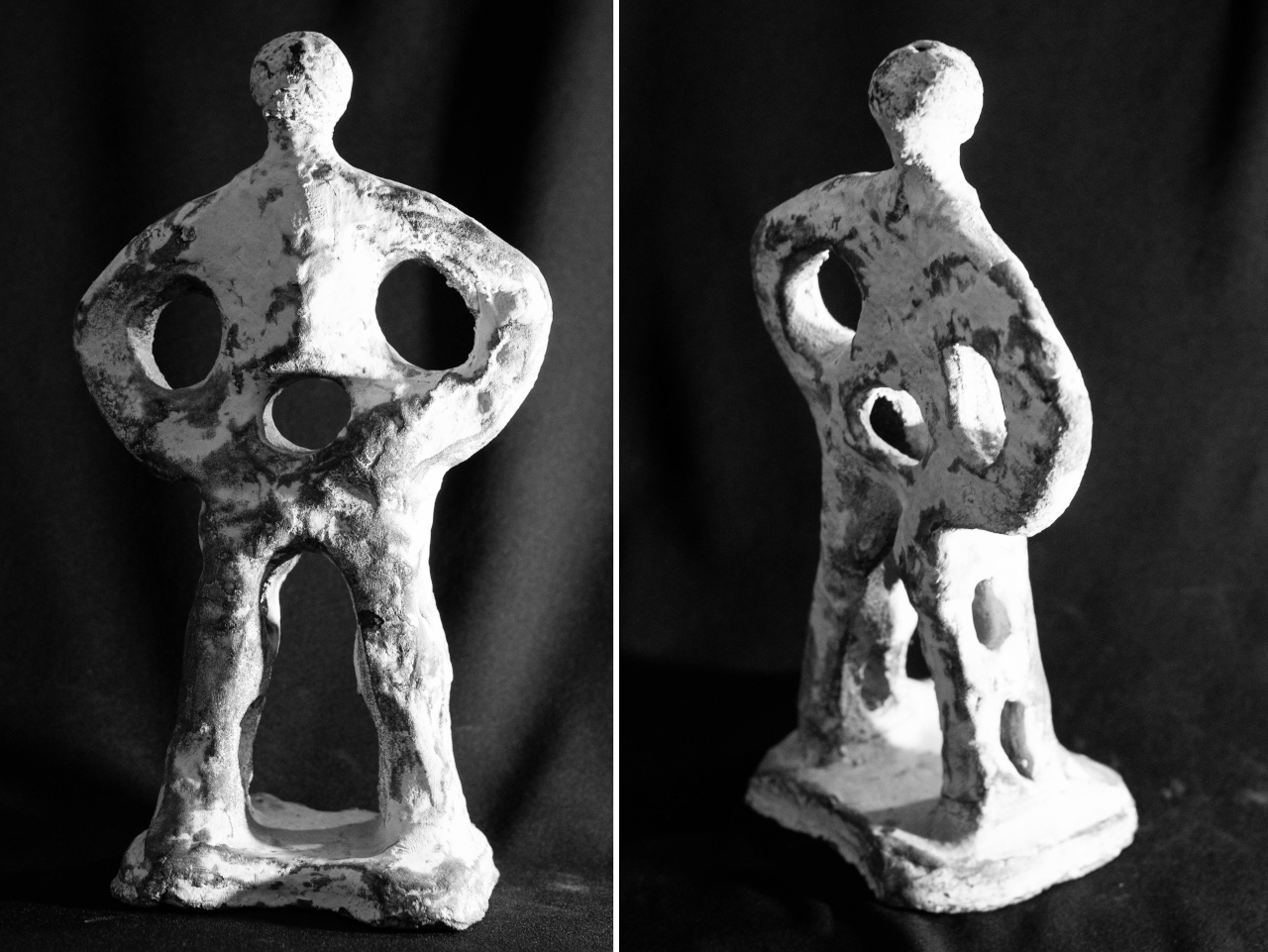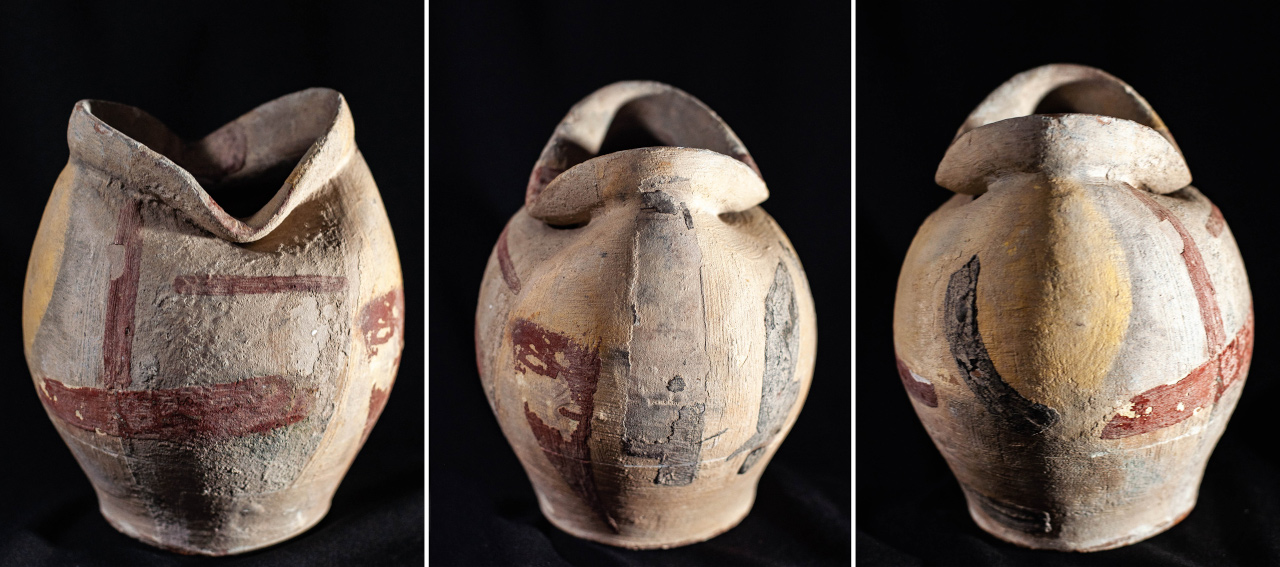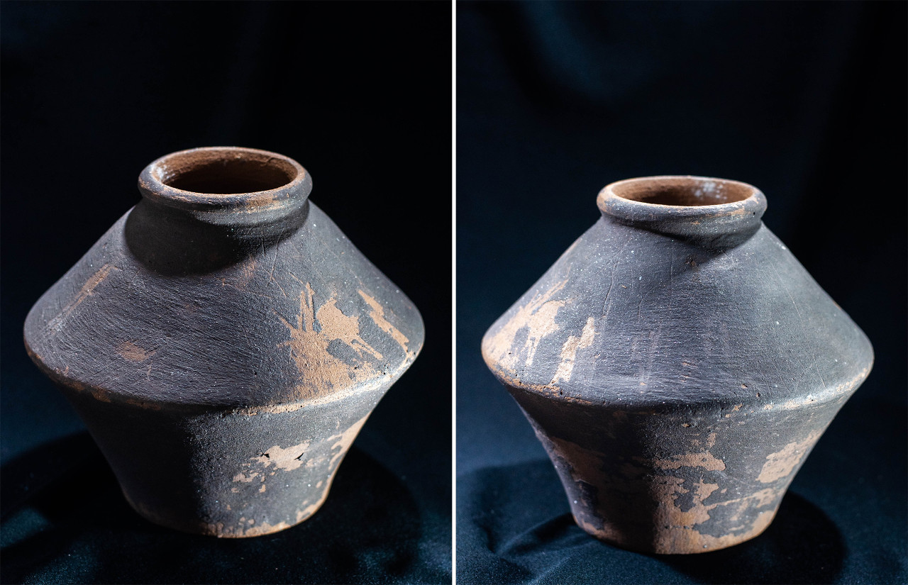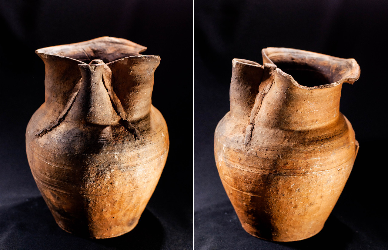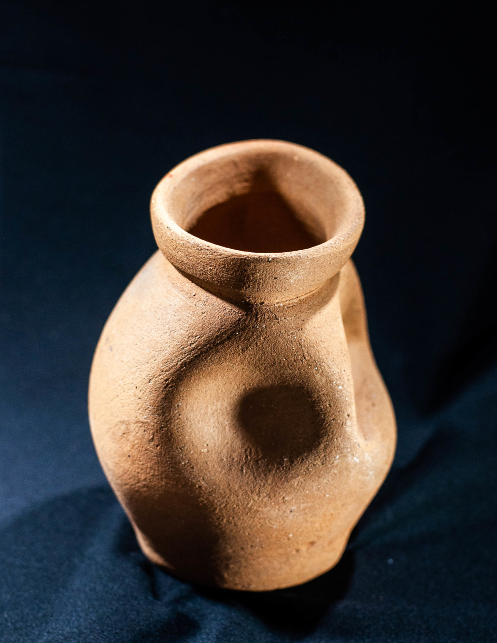 Algunas incluyen un agujero en medio, todo asimetrías y movimiento, frecuentemente pellizcados y con abolladuras, con o sin asa, y tanto en arcilla gris como roja.